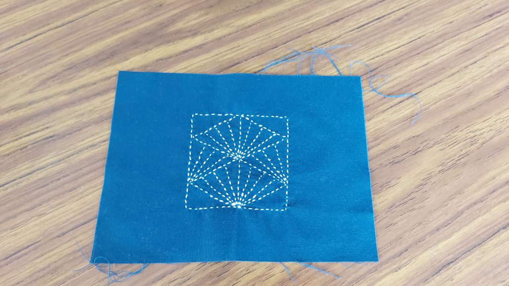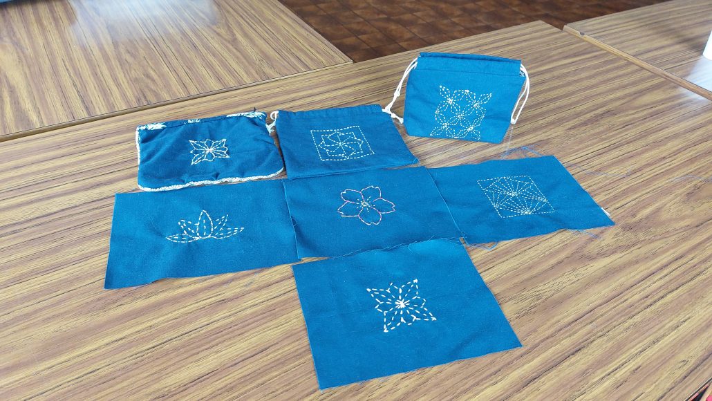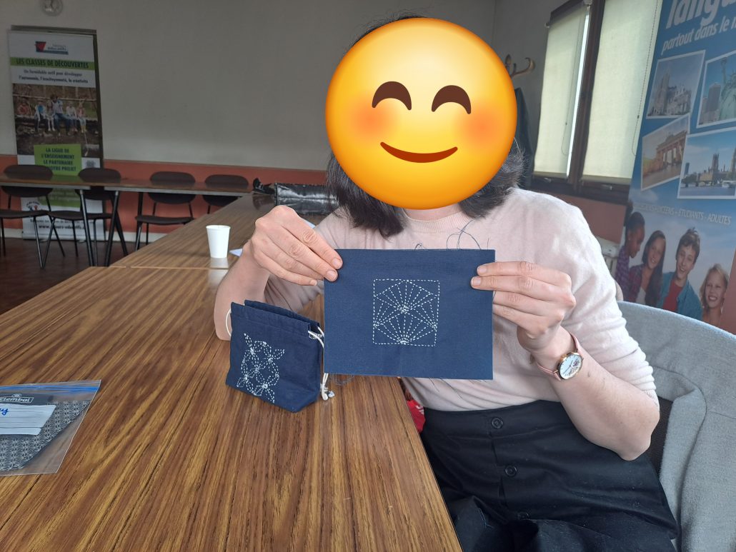 Le 13 avril, Florence a fait découvrir le sashiko (刺し子) à plusieurs adhérents d’Omotenashi. Cet art traditionnel japonais est une forme de broderie (sashiko signifie « petits points »), initialement développée pour rapiécer les vêtements à l’époque Edo. Depuis, le sashiko est devenue une véritable forme artistique, que nous avons pu tester en fabriquant un petit sac kinchaku. Le plus dur est encore de choisir, puis de dessiner le motif !